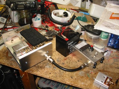 The bench in GM8OTI’s shack – 13cm home brew transverter under test.
