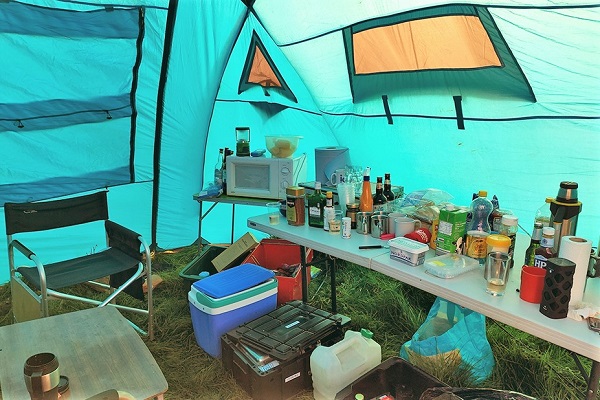 The atmosphere was quite different to that of a normal contest weekend and was very relaxed with no deadlines to meet. The station was assembled and tested the aerial system showing a return loss better than 25dB. On Saturday the weather was quite breezy with frequent showers that needed to be dodged. Colin assembled his field kitchen in a section of the messing tent and provided hot drinks between meal times. In the evening it looked more like a bar than the daytime canteen.