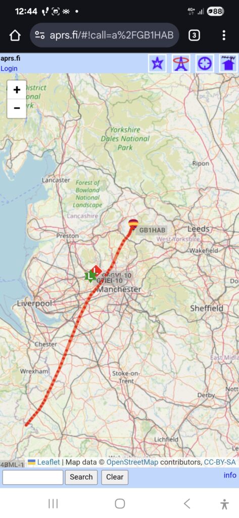 On the morning of the launch, weather radar showed a band of heavy rain across north Wales to the Humber. The launch site at Welshpool was wet, but the balloon was released at 11:10 BST as planned and it rose steadily at about 700 ft/min, drifting northeast. Arriving at East Lomond car park at 11:05 BST we spotted Dougie MM0ISH who was also trying the challenge and we chatted amicably while setting up. Our transmitter and antenna configurations were very similar, but we placed our Heltec board with its integrated GPS receiver a few feet further from the balloon launch site! Local conditions were dry at East Lomond, but wet in Currie. Setting up the antenna at the edge of the East Lomond parking area revealed a lump of local hillside just off the line of sight, but also some annoyingly high Pentland peaks directly in line with north Wales. Nothing daunted, our tracker was active by around 11:20 BST. An hour later at 12:20 BST and 48,556ft over Manchester the balloon burst, descending at 2,700 ft/min to land at 12:35 BST in a remote location near Thursden in West Yorkshire.